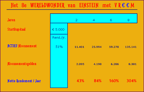 Bovenstaande tabel geeft de verwachte waarden van uw portefeuille weer als u start met een belegbaar vermogen van € 5000,- en u strikt aan de handelsdata van VR€€M houdt.